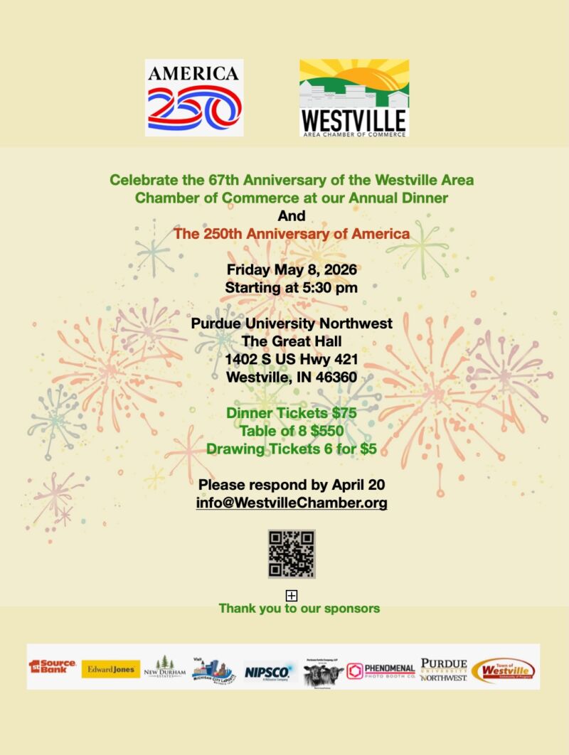 FeaturedPurdue University Northwest 1401 US 421, Westville, IN, United StatesPlease join us to celebrate our membership and share updates from 2025. During the event, we will announce our award winners in Education and Community. This evening is a wonderful opportunity to network with fellow members while staying informed about our recent progress. The schedule for the event is as follows: - 5:30 PM: Registration - 6:00 PM: Buffet Dinner - 7:00 PM: Program and Awards Presentation The dress code for the evening is business casual. If you are interested in sponsoring this event, please visit our sponsorship page at: https://westvillechamber.org/business-sponsorship-opportunities/ (https://westvillechamber.org/business-sponsorship-opportunities/) We look forward to seeing you there. Ticket sales [...]